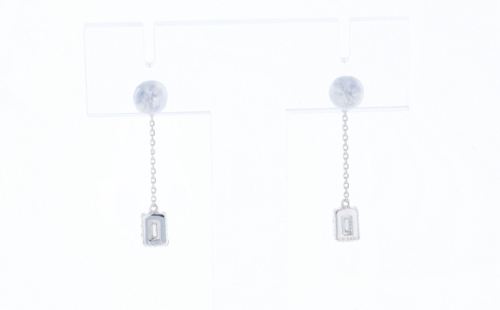 澄みきった透明感を持つ上質なバケットカットダイヤモンドを、メレダイヤで華やかに取り巻いたピアス。 プラチナ900の凛とした輝きが、ダイヤモンドの煌めきを一層引き立て、耳元に上品で洗練された存在感を添えます。 アズキチェーンを垂らしたロングデザインは、仕草に合わせて優雅に揺れ、顔まわりをすっきりと演出。 日常にも特別な日にも映える、ラグジュアリーで女性らしいダイヤモンドピアスです。