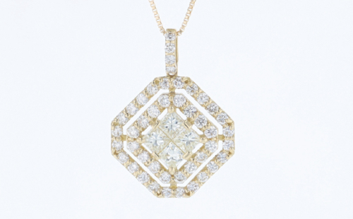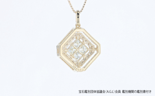 スクエアモチーフの中に、プリンセスカット、ラウンドカットなど多彩なカットのダイヤモンドを贅沢にセッティング。 トータル1.00ctの眩い輝きが、胸元を華やかに照らします。 透け感のあるフォルムが洗練された印象を与え、存在感がありながらも上品な仕上がりに。結婚式やパーティーなどのフォーマルシーンはもちろん、シンプルな装いにもエレガントな輝きを添えてくれます。