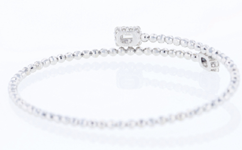 手首の太さや一日のむくみにも柔軟に対応し、その日の気分で着ける位置や重ね付けを楽しめる形状記憶フリーバングル。 バケットカットダイヤモンドをラウンドブリリアントのメレが囲むヘイローデザインがアクセント。 トータル0.52ctの上品な輝きで、手元を華やかに演出します。 高純度プラチナ900&850製で、変色しにくくしなやかな着け心地。 モダンでエレガントなデザインを長くお楽しみいただけます。
