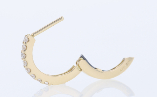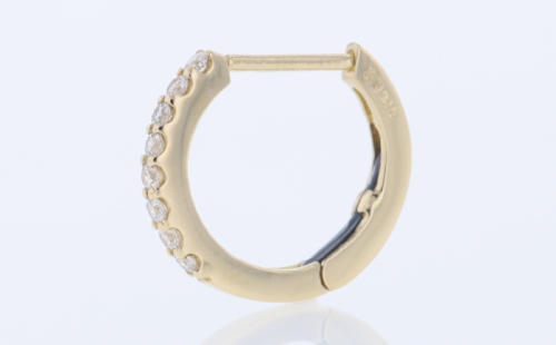 華奢なラインにダイヤモンドが煌めき、耳元をさりげなく上品に彩るフープピアス。 滑らかに肌になじむデザインは、日常を彩るライフジュエリーとして手放せない存在です。 中折れ式で簡単に留められ、ひっかかりも少なく安心してお使いいただけます。 程よいサイズ感が耳元に優雅な輝きを添え、日々のコーディネートに自然な華やぎをもたらします。 地金はK18イエローゴールドの温もりのある柔らかな輝きが、華やかさを引き立てます。