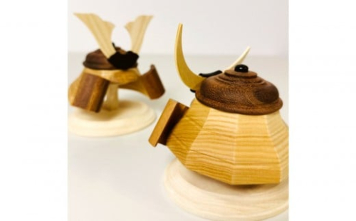静岡の木工職人が高度な加工技術を駆使し、複数の銘木を丁寧に削り出して仕上げた、洗練された木製兜飾り〈大鍬〉です。ホワイトアッシュ、モンキーポッド、黒檀、栓、ウォルナットなど、色合いや質感の異なる木材を組み合わせることで、天然木ならではの奥行きと重厚感を宿した上質な兜に仕上げています。
