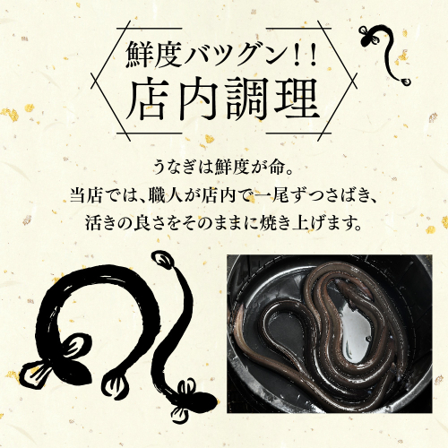 うなぎは鮮度が命。江口鮮魚店では、職人が店内で一尾ずつさばき、活きの良さをそのままに焼き上げます。