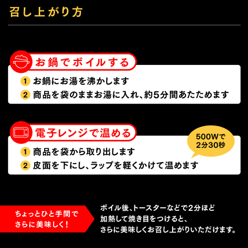 ボイル後、トースターなどで2分ほど加熱して焼き目をつけると、さらに美味しくお召し上がりいただけます。