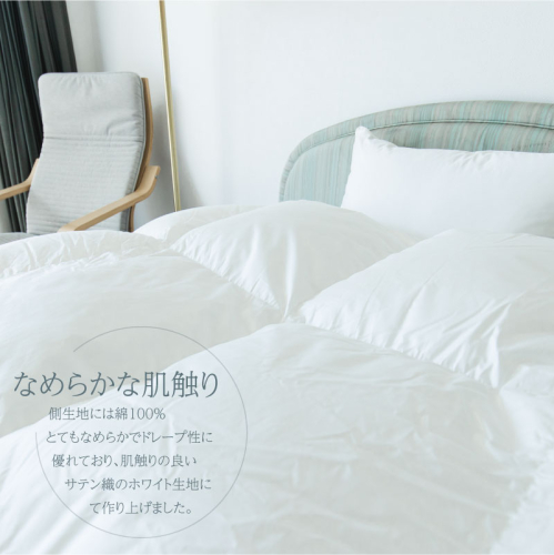 豊かな自然に恵まれ、古くから「甲斐絹」に代表される織物のまち山梨県都留市で寝具製品製造販売しております株式会社サンモトが推奨致します高級羽毛肌掛け布団。 厳選されたポーランド産マザーホワイトグースダウン93%を500g使用。優れた保温性、弾力性を数値化で表したダウンパワーは410dp以上。 側生地には綿100%、とてもなめらかでドレープ性に優れており肌触りの良い生地にて作り上げた最高級の商品です。 熟練の職人がひとつずつ丁寧に作り上げております。 ワンランク上の快適な眠りをお楽しみ頂けます。