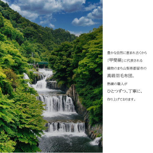 豊かな自然に恵まれ、古くから「甲斐絹」に代表される織物のまち都留市で寝具製品製造販売しております、株式会社サンモトが推奨致します超軽量羽毛掛けふとん。