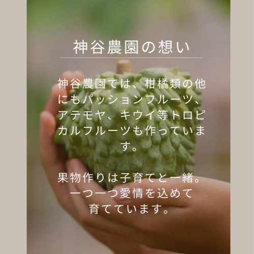神谷農園では、柑橘類の他にもパッションフルーツ、アテモヤ、キウイ等トロピカルフルーツも作っています。