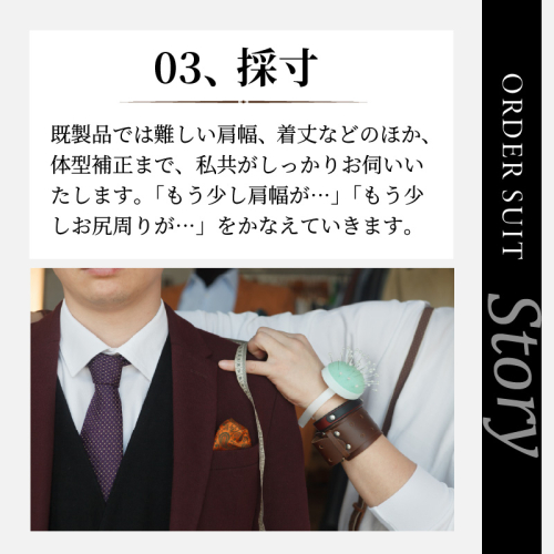 ベーシックな無地から鮮やかな色柄まで豊富なサンプルから生地を選び、お好みのデザインで貴方だけのこだわりの1着をお仕立いたします。