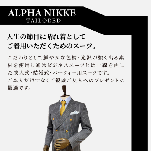 成人式・結婚式・パーティーなど大切な日を華やかに彩る晴れ着としてご着用いただける高級セレモニースーツです。