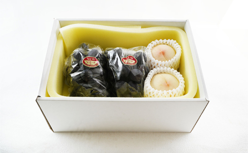 - 桃 ぶどう 2026年 先行予約 果物詰合せ 白桃 2玉(1玉200g以上) ニュー ピオーネ 2房(合計約940g)化粧箱入り 岡山県産 国産 フルーツ 果物 ギフト 贈り物 セット