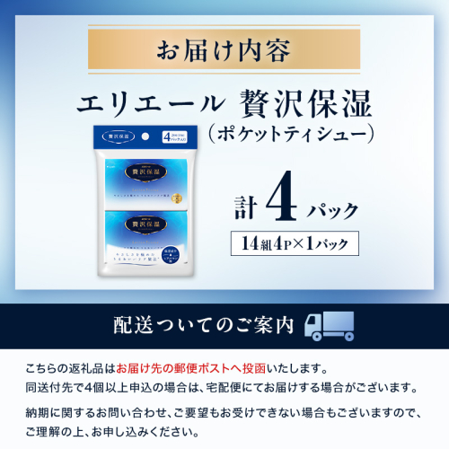 • エリエール 贅沢保湿 ポケットティシュー[14組4パック]×1個  お試し 持ち歩き 風邪 花粉症 柔らか  雑貨 日用品 ポケットティッシュ しっとり感 デリケート肌
