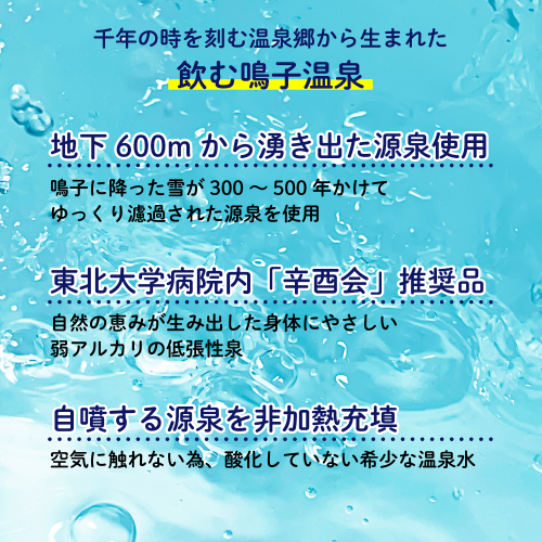 宮城県鳴子温泉郷の大自然が育んだ天然温泉水「まつばら源泉」。 300年以上の歳月をかけて濾過された弱アルカリ性の温泉水を、地下600mから自噴し、非加熱・無添加で空気に触れずにボトリングしました。 まろやかな口当たりとすっきりとした飲み心地で、体の内外から健康と美容をサポート。 医師や大学教授の監修を受け、安心してお飲みいただける品質です。 全国の病院売店でも採用される確かな実績を持ち、鮮度と安全性にこだわった一本。 名湯・鳴子温泉の恵みを、ご家庭で手軽にお楽しみいただけます。