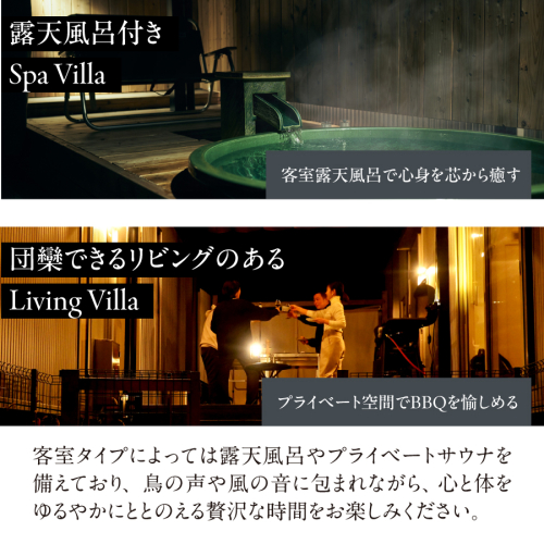 客室タイプによっては露天風呂やプライベートサウナを備えており、鳥の声や風の音に包まれながら、心と体をゆるやかにととのえる贅沢な時間をお楽しみください。