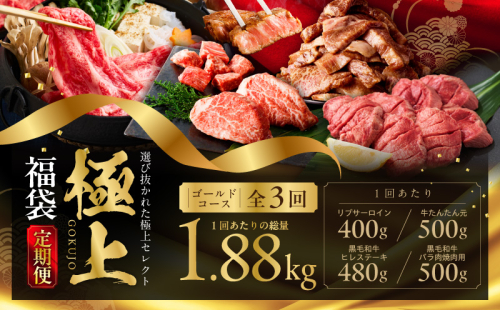 極上福袋 定期便 ゴールドコース 全3回【5種 食べ比べ 牛肉 ステーキ 牛タン 焼肉 しゃぶしゃぶ すき焼き 氷温熟成×極味付け 毎月配送コース】 mrzZ030