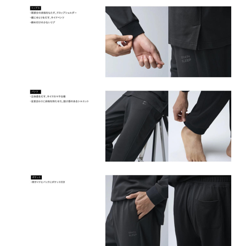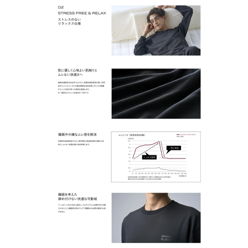 睡眠のことを考えたストレスのないリラックス仕様と、肌に優しく快適な着心地。