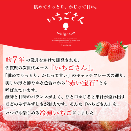 約7年の歳月をかけて開発された、佐賀県の次世代エース『いちごさん』。 「眺めてうっとり、かじって甘い」のキャッチフレーズの通り、美しい形と鮮やかな色合いから“赤い宝石”とも呼ばれています。 酸味と甘味のバランスがよく、ひと口かじると果汁が溢れ出すほどのみずみずしさが魅力です。 そんな『いちごさん』を、いつでも楽しめる冷凍いちごにしました! スムージーやシャーベット、かき氷機で削って“けずり苺”としてもお楽しみいただけます。 さらに、いちごに含まれるビタミンCは果物の中でもトップクラス! 6〜7粒で1日に必要なビタミンCを補えるほどで、美肌づくりや風邪予防にも効果が期待できます。 500gの小分け袋入りで、冷凍保存にも便利。ご家庭用はもちろん、おすそ分けにもおすすめです。 佐賀が誇る“赤い宝石”を、ぜひご堪能ください。 いちごアイス・スムージー・ジャム等にもご使用いただけます。 シャーベット(そのまま)で食べるのもおすすめです。 【地場産品基準】 8ハ : 佐賀県認定地域資源:いちごさん