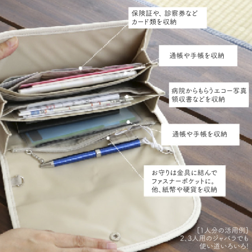 マルチケース(ジャバラタイプ)は、母子手帳ケース、お薬手帳ケース、通帳ケース、年金手帳ケース、パスポートケース、カードケース、書類ケース、バッグなど様々な用途でお使いいただけます。