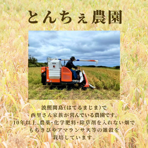 日本最南端の有人島、沖縄県波照間島で育った、とんちぇ農園の「もちきび」です。 健康にこだわって作られており、農薬・化学肥料は一切使用しておりません。 のんびりとした島時間が流れる波照間島で育てられた、うまみたっぷりのもちきび。 波照間島の強い日差しとミネラル豊富な大地でのびのび育ったもちきびは、炊くと驚くほどもちもちとした食感が特徴です。 また、もちきびは白米と比較して食物繊維やミネラル、ビタミンB群などが豊富に含まれており、お米に混ぜて炊けば、いつものご飯がぐっと美味しくなり、栄養価もアップします。 <おいしい食べ方> (1)白米1合にもちきびを大さじ1杯混ぜる。 (2)白米を炊くのと同じ水量で白米コースで炊く。 ※画像はイメージです。