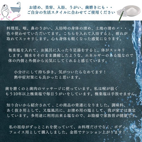 お清め、美容、入浴、うがい、歯磨きにも・・ご自分の生活スタイルに合わせてご使用ください