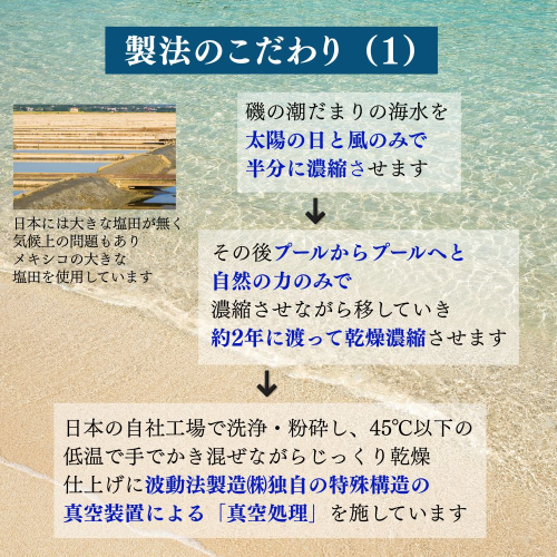 ただ日本には大きな塩田が無く気候上の問題から、メキシコの大きな塩田を使用しています。天日と風のみで、磯の潮だまりの海水を半分に濃縮させたものを、プールからプールへと濃縮させながら移していき、約2年に渡って乾燥濃縮させます。それを日本の自社工場で洗浄・粉砕し、45℃以下の低温で手でかき混ぜながらじっくり乾燥させ、仕上げに波動法製造(株)独自の特殊構造の真空装置による「真空処理」を施しています。