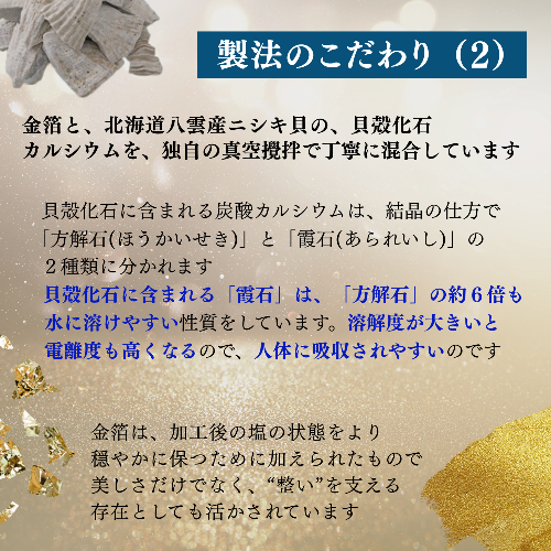 (2)金箔と、北海道産八雲産ニシキ貝の、貝殻化石カルシウムを独自の真空攪拌で丁寧に混合しています。 貝殻化石に含まれる炭酸カルシウムは、結晶の仕方で「方解石(ほうかいせき)」と「霞石(あられいし)」の2種類に分かれます。貝殻化石に含まれる「霞石」は、「方解石」の約6倍も水に溶けやすい性質をしています。溶解度が大きいと電離度も高くなるので、人体に吸収されやすいのです。