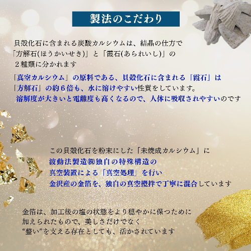 この貝殻化石を粉末にした「未焼成カルシウム」に、波動法製造(株)独自の特殊構造の真空装置による「真空処理」を行い、金箔を入れて製造しています。金箔は、加工後の塩の状態をより穏やかに保つために加えられたもので、美しさだけでなく、“整い”を支える存在としても活かされています。