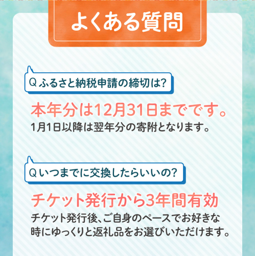 1. ギフト交換の有効期限は、発行より3年間です。有効期限内に必ず、ギフト交換をお願いいたします。