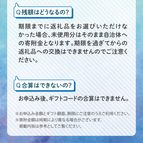 ※お申込み後、ギフトコードの合算は出来ませんので、お申込み金額とギフト額面にご注意ください。