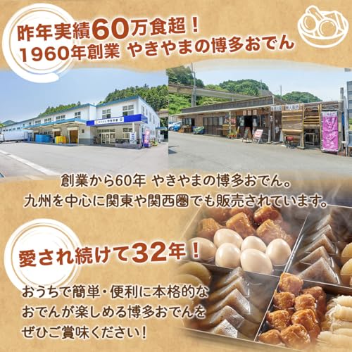 1960年創業の「株式会社やきやま」です。 1989年に発売し、今では九州を中心に関東や関西圏でも取り扱っていただき、昨年実績60万食を超える、32年間売れ続けている「博多おでん」を返礼品としてご提供いたします。 かつおベースのだしにアゴだしを加えた本格スープで味付けし、九州ではベーシックな6種類の具材(糸こんにゃく・ちくわ・玉子・ごぼう巻・三角こんにゃく・大根)が入ったレトルトおでんです。 人気の6種類が各1個ずつ入っています。 スープたっぷり、袋から出して温めるだけの簡単おでんです。1人前に丁度良い500gです。 残ったスープにうどん麺を入れても美味しくいただくことができますので、スープの残り一滴まで楽しんでいただける「博多おでん」を是非ご賞味ください。 ■注意事項/その他 ※本お礼品は常温でのお届けとなります。お使いになるときは、お鍋にお湯を沸かし、温めてからお召し上がりいただくことをお勧めします。 ※画像はイメージです。 提供元 株式会社 やきやま