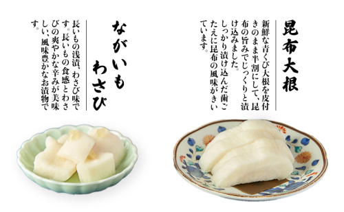 長いもの食感とわさびの爽やかな辛みが美味しい、風味豊かなお漬物です。
