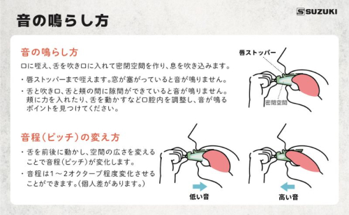口に咥え、舌を吹き口に入れて密閉空間を作り、息を吹き込んで音を鳴らします。
