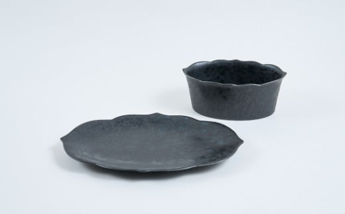 桔梗のデザインのプレートとボウルセット プレートは刺身皿やお肉など盛りつけられます。 深さのあるボウルです。サラダや汁物にもお使いいただけます。 黒陶は窯の中で起きた変化(窯変)によってできた、ひとつとして同じものがない器です。 窯の変化によって薄い斑紋のレイヤーが重なり風格を帯びた仕上がりになっています。 また、器の中に青い表情が見られる場合があります。 ※手作業のため色ムラや釉垂れなど個体差がございます。予めご了承ください。 ※画像はイメージです。セット内容はプレートとボウルの2点です。 窯元:金善製陶所