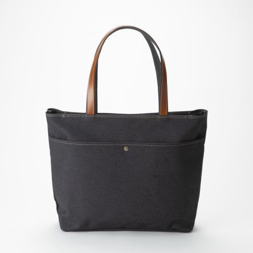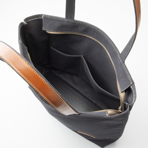 口元には落とし込みファスナーを採用し、荷物の飛び出しを防ぎながら、すっきりとした見た目に。背面と内側にはポケットを備え、整理しやすく、持ち手は表に革、裏に本体と同じ帆布を使用した二重構造で、肩掛けも可能なしっかりとしたつくりです。