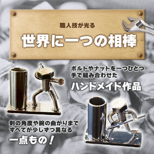 ボルトやナット、ワッシャーを一つひとつ丁寧に組み合わせたハンドメイド作品です。刀の角度、腕の曲がり具合、絶妙な重心の取り方。すべてが少しずつ違う「一点物」。あなただけのネジの助との出会いをお楽しみください。