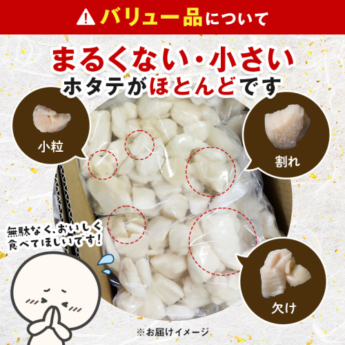 ・玉冷ほたて貝柱につきまして、粒一つ一つの大きさにバラつきがございます。またサイズ不選別で、半分に割れたものや、一部欠けたものが入っておりますが、味に遜色はございません。