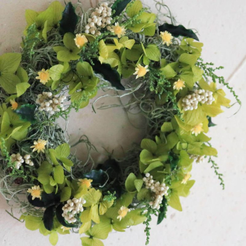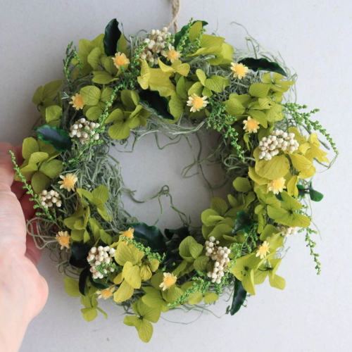 ※つる製のベースにお花やグリーンをひとつずつつけて手作りしていますので、形や大きさ、色に個性があります。