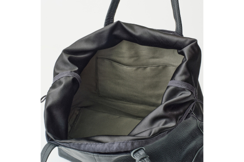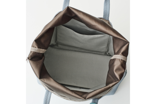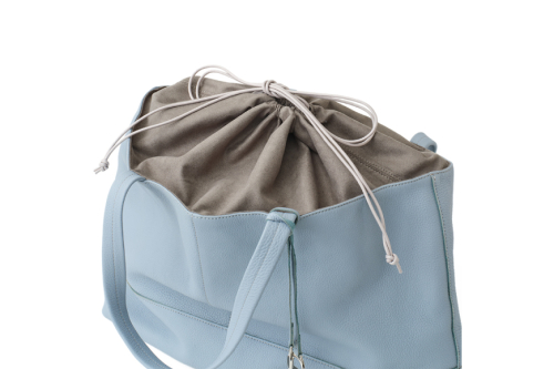 スエード調の巾着を中に落とせばオープントートとしてもお使いいただくことができ、底板と大きなマチでたっぷり収納でき、底板をとればスマートにマチをたためます。