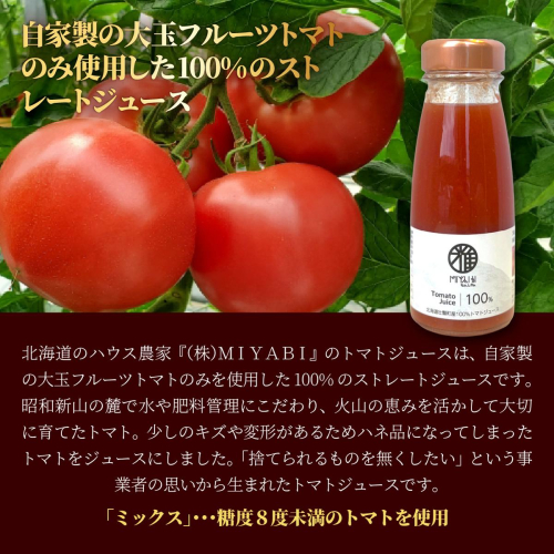 壮瞥町のハウス農家『(株)MIYABI』のトマトジュースは、自家製の大玉フルーツトマトのみを使用した100%のストレートジュースです。