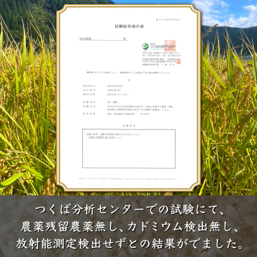 つくば分析センターでの試験にて、残留農薬なし、カドミウム検出なし、放射能測定検出せずとの結果がでました。