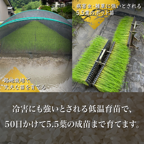 低温育苗50日の露地栽培で、丈夫な苗に育ててから田植えを行います。また活着が早いため初期生育が良く、病害虫・雑草にも強いとされる5.5葉のポット苗を使用。