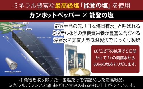 日本海・能登の深海水から作られた塩を使用。まろやかなコクと旨みが胡椒の風味を引き立てます。