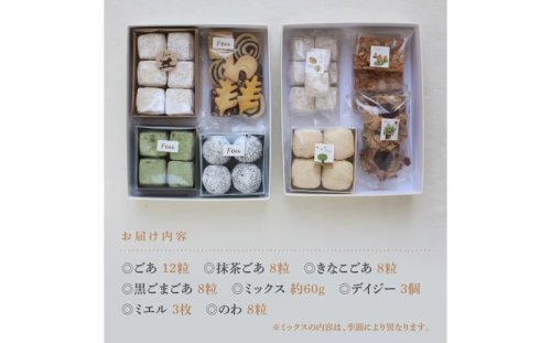 クッキー ごあ(12粒)、抹茶ごあ(8粒)、きなこごあ(8粒)、黒ごまごあ(8粒)、デイジー(3個)、ミックス(約60g)、ミエル(3枚)、のわ(8粒)