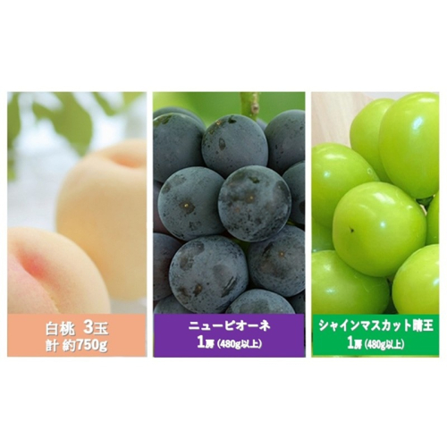 7月:岡山白桃3玉、8月:ニューピオーネ1房、9月:シャインマスカット「晴王」1房をお届けします。