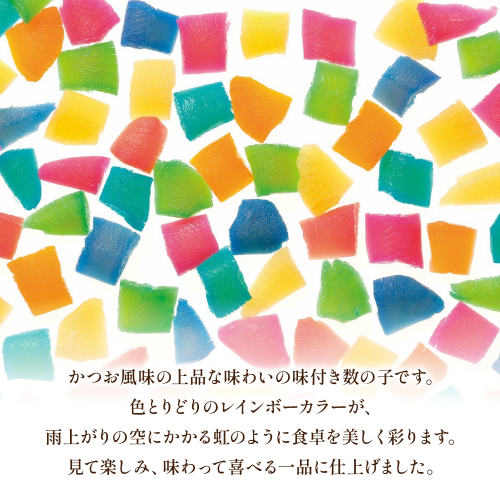 色とりどりのレインボーカラーが、雨上がりの空にかかる虹のように食卓を美しく彩る味付け数の子です。見て楽しみ、味わって喜べる一品に仕上げました。かつお風味の上品な味わいは、サラダなどにも相性抜群。贈り物としてもふさわしい彩りを届けます。