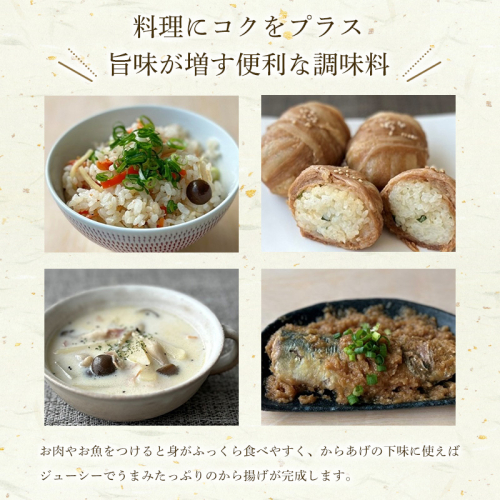お肉やお魚をつけると身がふっくらに食べやすく、から揚げの下味に使えばジューシーでうまみたっぷりのから揚げが完成します。