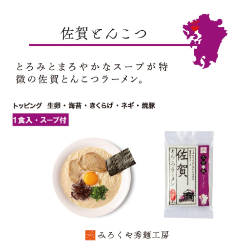 【みろくや秀麺オススメのラーメン食べ比べセット】 九州各地の味を楽しめるラーメンセットです。 ・佐賀ラーメン3食 自社の工房にて独自製法でつくりあげる半生麺。 生麺と同等の風味を持ちながら、常温で90日保存を実現した、生麺と乾麺の良いところを合わせ持った麺です。 80年の歴史で培った技術と、熟練した職人たちの季節・天候に合わせた生地の状態、麺の乾燥具合など繊細な調整ででき上がっております。