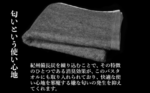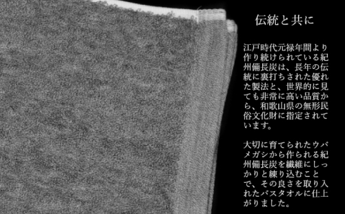 紀州産のウバメガシから作られた最高級木炭の紀州備長炭を繊維に閉じ込めた糸を採用し、化学染料では決して表現できない独特で素朴な色合いを表現したタオルです。炭の効果として知られる臭いを吸着する消臭効果も特徴です。 綿90%レーヨン10% 製造:泉佐野市