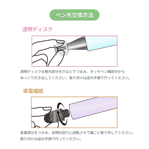 導電繊維と透明ディスクの替え芯を各1個ずつ同梱しています。替え芯の交換方法は取扱説明書に掲載しているため、タッチペンを初めて購入される方にもおすすめです。