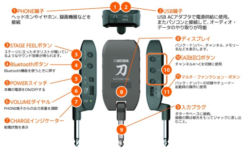 ●コントロール…マスター・ボリューム、POWERスイッチ、Aボタン、Bボタン、Cボタン、Bluetooth(R)ボタン、STAGE FEELボタン、マルチ・ファンクション・ボタン