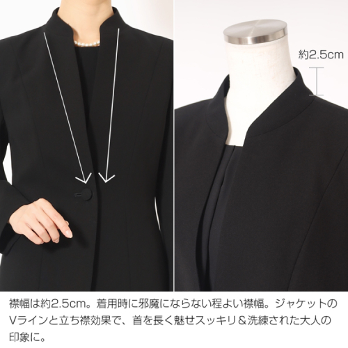 短めのスタンドカラーで首を長くスッキリと魅せてくれます。