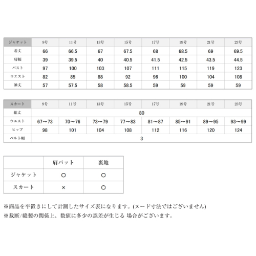 ジャケット・スカート共通:表地・裏地 ポリエステル100%